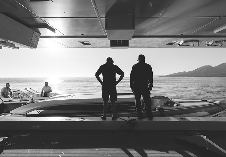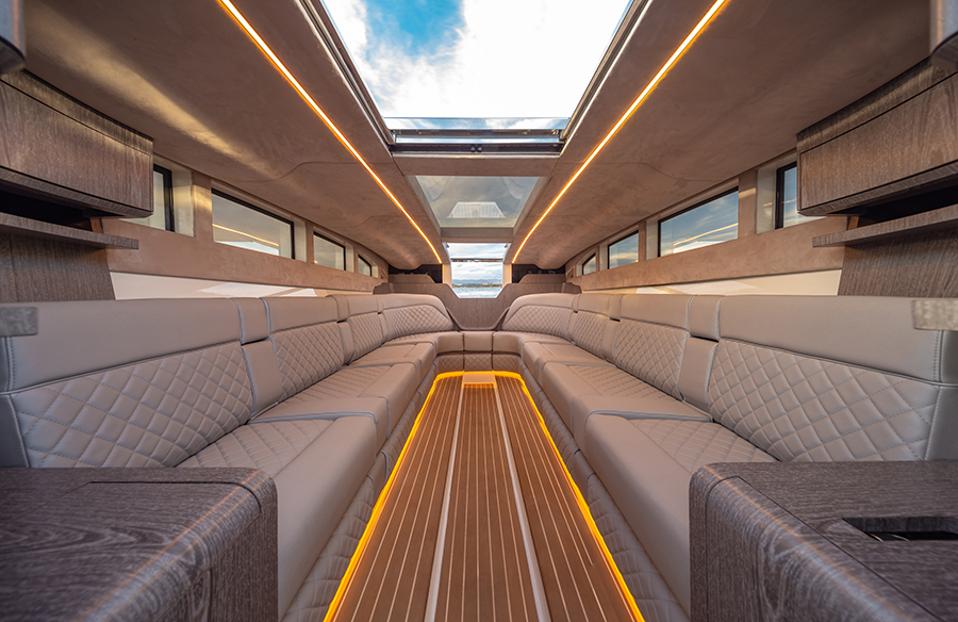 todos os superiachts são opulentos o suficiente para serem equipados com um objeto que representa o epítome do luxo—uma limusine tender—como a Onda 321L., E como a maioria das limusinas de iate, é composta por três zonas distintas. O leme está separado da área de hóspedes na frente do barco. A parte de trás é composta por uma grande plataforma de natação e embarque, enquanto a grande seção coberta no meio é um luxuoso como ele fica.