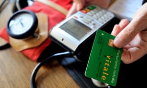 sob o equivalente estatal do NHS em França, a maioria dos doentes deve pagar ao médico ou profissional de saúde antecipadamente. Em seguida, o estado reembolsa-os parcial ou totalmente. O paciente tem liberdade para escolher o médico ou serviço a visitar. todas as transacções de saúde se centram num cartão inteligente, o Carte Vitale. Uma visita GP custa € 23 (£17), O Carte Vitale é roubado e o dinheiro é pago de volta para a conta bancária do paciente dentro de cinco dias. Em geral, a taxa de reembolso do estado situa-se entre 70% e 100%., Os mais pobres e os doentes de longa duração estão cobertos a 100%.